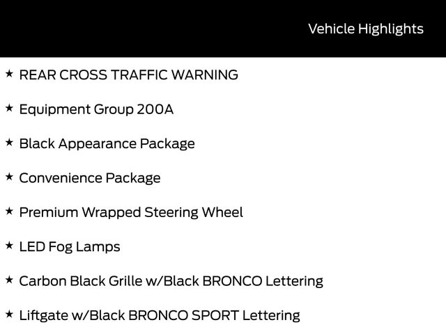 BACK UP CAMERA, BLUETOOTH, HEATED SEATS, REMOTE START, CRUISE CONTROL, POWER WINDOWS, POWER LOCKS, STEERING WHEEL CONTROLS, AWD / 4WD, LANE DEPARTURE WARNING, LANE KEEP ASSIST, APPLE CARPLAY, ANDROID AUTO, FORD SYNC, AUTOMATIC EMERGENCY BRAKING, FORWARD COLLISION WARNING, REAR CROSS TRAFFIC WARNING, Black Appearance Package, Carbon Black Grille w/Black BRONCO Lettering, Cargo Mat, Convenience Package, Equipment Group 200A, Front & Rear Floor Liners w/o Carpet Mats, Front Driver/Passenger Seat Back Map Pockets, Heated 8-Way Power Driver's Seat, LED Fog Lamps, Liftgate w/Black BRONCO SPORT Lettering, Painted Shadow Black Roof, Premium Trimmed Htd Fr Sport Contour Bucket Seats, Premium Wrapped Steering Wheel, Universal Garage Door Opener (UGDO), Wheels: 17" Matte Black-Painted Aluminum. 25/30 City/Highway MPG