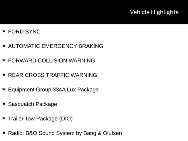 LEATHER SEATS, BACK UP CAMERA, BLUETOOTH, HEATED SEATS, TOW PACKAGE / TRAILER HITCH, REMOTE START, CRUISE CONTROL, POWER WINDOWS, POWER LOCKS, MULTI-ZONE CLIMATE CONTROL, STEERING WHEEL CONTROLS, AWD / 4WD, LANE DEPARTURE WARNING, LANE KEEP ASSIST, APPLE CARPLAY, ANDROID AUTO, FORD SYNC, AUTOMATIC EMERGENCY BRAKING, FORWARD COLLISION WARNING, REAR CROSS TRAFFIC WARNING, 2-Door Intelligent Access w/Lock/Unlock, 360-Degree Camera, 4.7 Final Drive Ratio, Adaptive Cruise Control, Ambient Footwell Lighting, Connected Navigation, Dr & Pass Illuminated Sliding Visor Vanity Mirrors, Dual Smart Charging USB Ports, Dual-Zone Electronic Automatic Temperature Control, Equipment Group 334A Lux Package, Evasive Steering Assist, Front Parking Sensors, Front Row Heated Seats, High Clearance Fender Flares, High Clearance Suspension, Information on Demand Panel, Position-Sensitive Bilstein Shock Absorbers, Power Outlet - Back Side of Center Floor Console, Radio: B&O Sound System by Bang & Olufsen, Rear Parking Sensors, Sasquatch Package, Sideview Mirrors, Trailer Tow Package (DIO), Universal Garage Door Opener, Wheels: 17" Carbonized Gray Painted Aluminum.
