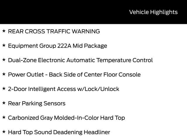 BACK UP CAMERA, BLUETOOTH, REMOTE START, CRUISE CONTROL, POWER WINDOWS, POWER LOCKS, MULTI-ZONE CLIMATE CONTROL, STEERING WHEEL CONTROLS, AWD / 4WD, LANE DEPARTURE WARNING, LANE KEEP ASSIST, APPLE CARPLAY, ANDROID AUTO, FORD SYNC, AUTOMATIC EMERGENCY BRAKING, FORWARD COLLISION WARNING, REAR CROSS TRAFFIC WARNING, 2-Door Intelligent Access w/Lock/Unlock, Ambient Footwell Lighting, Carbonized Gray Molded-In-Color Hard Top, Connected Navigation, Dr & Pass Illuminated Sliding Visor Vanity Mirrors, Dual Smart Charging USB Ports, Dual-Zone Electronic Automatic Temperature Control, Equipment Group 222A Mid Package, Front Row Heated Seats, Hard Top Sound Deadening Headliner, Power Outlet - Back Side of Center Floor Console, Rear Parking Sensors, Rear-Window Defroster & Washer.