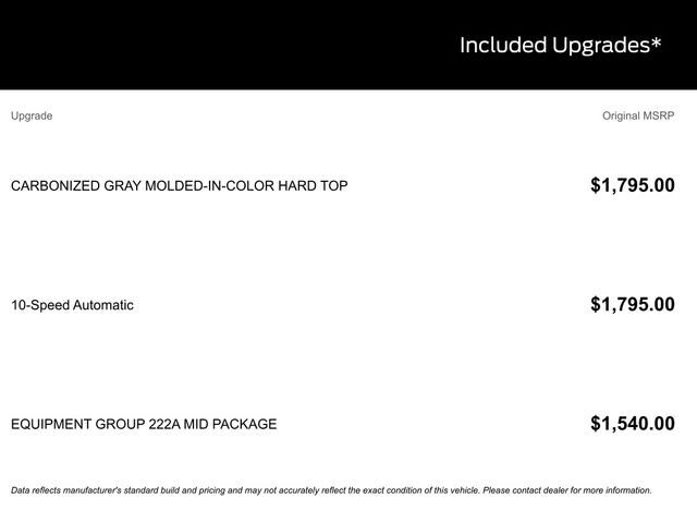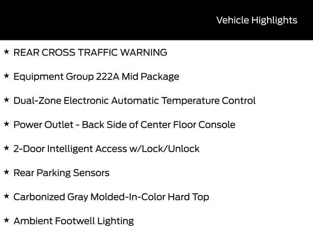 BACK UP CAMERA, BLUETOOTH, REMOTE START, CRUISE CONTROL, POWER WINDOWS, POWER LOCKS, MULTI-ZONE CLIMATE CONTROL, STEERING WHEEL CONTROLS, AWD / 4WD, LANE DEPARTURE WARNING, LANE KEEP ASSIST, APPLE CARPLAY, ANDROID AUTO, FORD SYNC, AUTOMATIC EMERGENCY BRAKING, FORWARD COLLISION WARNING, REAR CROSS TRAFFIC WARNING, 2-Door Intelligent Access w/Lock/Unlock, Ambient Footwell Lighting, Carbonized Gray Molded-In-Color Hard Top, Connected Navigation, Dr & Pass Illuminated Sliding Visor Vanity Mirrors, Dual Smart Charging USB Ports, Dual-Zone Electronic Automatic Temperature Control, Equipment Group 222A Mid Package, Front Row Heated Seats, Power Outlet - Back Side of Center Floor Console, Rear Parking Sensors, Rear-Window Defroster & Washer.