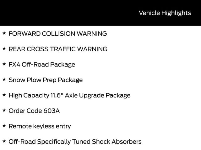 BACK UP CAMERA, BLUETOOTH, TOW PACKAGE / TRAILER HITCH, REMOTE START, CRUISE CONTROL, POWER WINDOWS, POWER LOCKS, MULTI-ZONE CLIMATE CONTROL, STEERING WHEEL CONTROLS, AWD / 4WD, LANE DEPARTURE WARNING, LANE KEEP ASSIST, APPLE CARPLAY, ANDROID AUTO, FORD SYNC, AUTOMATIC EMERGENCY BRAKING, FORWARD COLLISION WARNING, REAR CROSS TRAFFIC WARNING, 4WD, ABS brakes, Alloy wheels, Compass, Electronic Stability Control, FX4 Off-Road Package, Heated door mirrors, High Capacity 11.6" Axle Upgrade Package, Hill Descent Control, Illuminated entry, Low tire pressure warning, Off-Road Specifically Tuned Shock Absorbers, Order Code 603A, Remote keyless entry, Snow Plow Prep Package, Traction control, Unique FX4 Off-Road Box Decal.