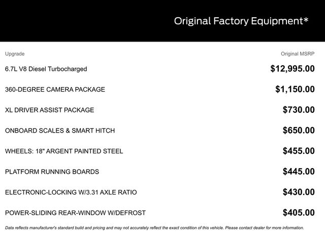 ⢠6.7L V8 Diesel Turbocharged (High Output) (Power Stroke) (B20 Biodiesel Compatible) (Includes Operator Commanded Regeneration (OCR), Intelligent Oil-Life Monitor, Manual Push-Button Engine-Exhaust Braking, 190 Amp Alternator, GVWR: 11,499 lb Payload Package, 48 Gallon Fuel Tank, Dual 68 AH/65 AGM Battery, 3.31 Axle Ratio)