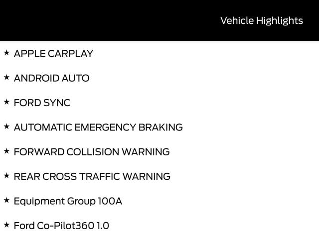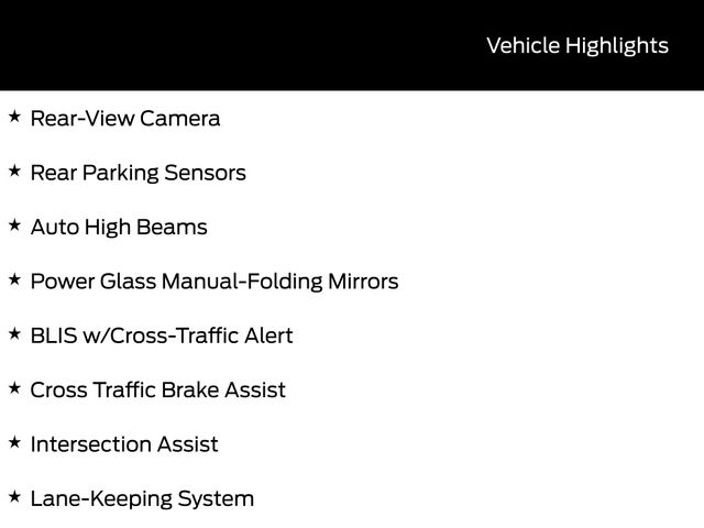 BACK UP CAMERA, BLUETOOTH, CRUISE CONTROL, POWER WINDOWS, POWER LOCKS, STEERING WHEEL CONTROLS, LANE DEPARTURE WARNING, LANE KEEP ASSIST, APPLE CARPLAY, ANDROID AUTO, FORD SYNC, AUTOMATIC EMERGENCY BRAKING, FORWARD COLLISION WARNING, REAR CROSS TRAFFIC WARNING, 2.5L I-4 Hybrid, Auto High Beams, BLIS w/Cross-Traffic Alert, Cross Traffic Brake Assist, Equipment Group 100A, Evasive Steering Assist, Ford Co-Pilot360 1.0, Intersection Assist, Lane-Keeping System, Power Glass Manual-Folding Mirrors, Pre-Collision Assist w/Automatic Emergency Braking, Rear Parking Sensors, Rear-View Camera. 42/35 City/Highway MPG