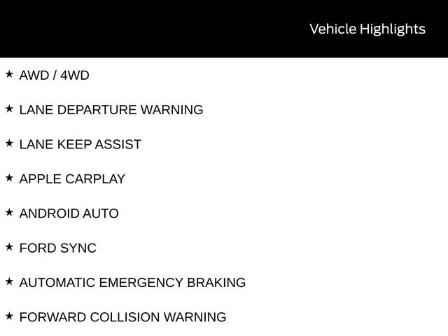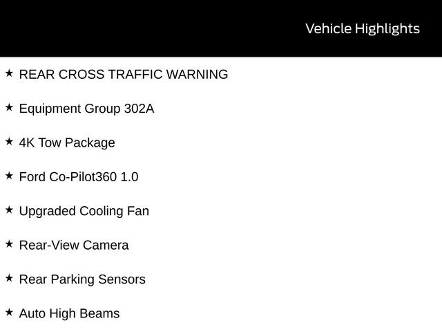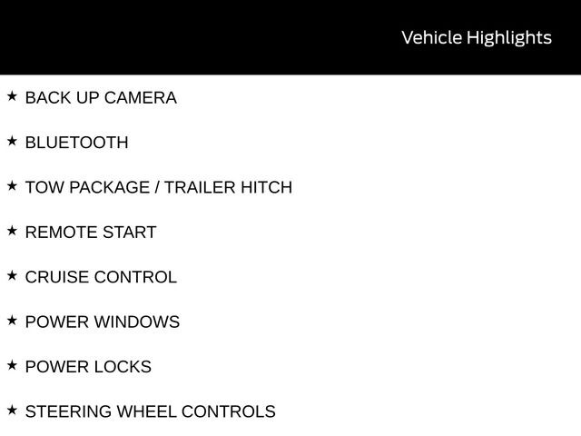 BACK UP CAMERA, BLUETOOTH, TOW PACKAGE / TRAILER HITCH, REMOTE START, CRUISE CONTROL, POWER WINDOWS, POWER LOCKS, STEERING WHEEL CONTROLS, AWD / 4WD, LANE DEPARTURE WARNING, LANE KEEP ASSIST, APPLE CARPLAY, ANDROID AUTO, FORD SYNC, AUTOMATIC EMERGENCY BRAKING, FORWARD COLLISION WARNING, REAR CROSS TRAFFIC WARNING, 4K Tow Package, Auto High Beams, BLIS w/Cross-Traffic Alert, Cross Traffic Brake Assist, Equipment Group 302A, Evasive Steering Assist, Ford Co-Pilot360 1.0, Intersection Assist, Lane-Keeping System, Power Glass Manual-Folding Mirrors, Pre-Collision Assist w/Automatic Emergency Braking, Rear Parking Sensors, Rear-View Camera, Trailer Brake Controller, Trailer Hitch (Class III) 2" Receiver, Transmission Oil Cooler, Upgraded Cooling Fan.
