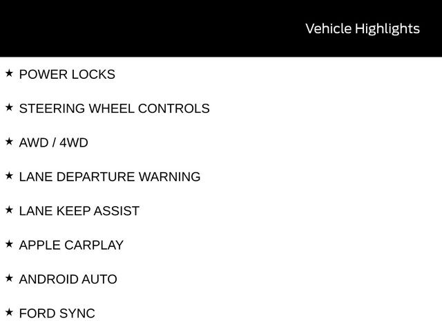 BACK UP CAMERA, BLUETOOTH, HEATED SEATS, TOW PACKAGE / TRAILER HITCH, 3RD ROW SEATS, REMOTE START, CRUISE CONTROL, POWER WINDOWS, POWER LOCKS, STEERING WHEEL CONTROLS, AWD / 4WD, LANE DEPARTURE WARNING, LANE KEEP ASSIST, APPLE CARPLAY, ANDROID AUTO, FORD SYNC, AUTOMATIC EMERGENCY BRAKING, FORWARD COLLISION WARNING, REAR CROSS TRAFFIC WARNING, 4WD, 8 USB Ports, Active Badging, Active Noise Cancellation, Black Roof-Rack Side Rails, Equipment Group 200A Standard Package, Manual-Folding Sideview Mirrors, Power Liftgate, Unique Cloth Heated Captain's Chairs, Vinyl-Wrapped Steering Wheel.