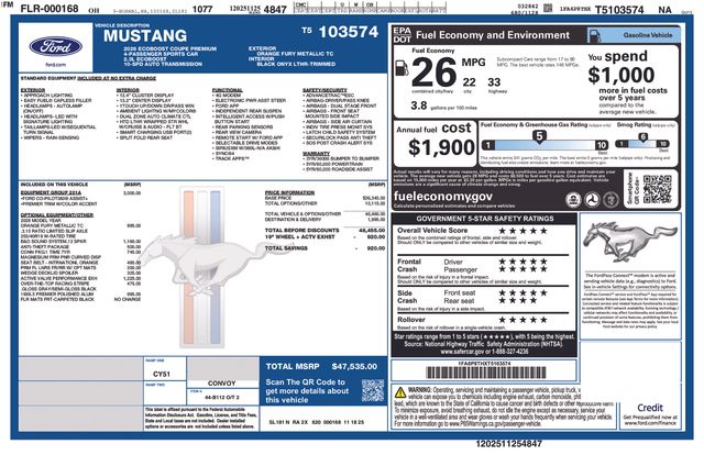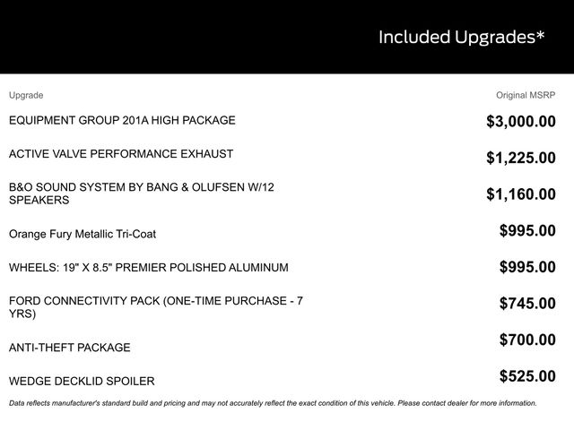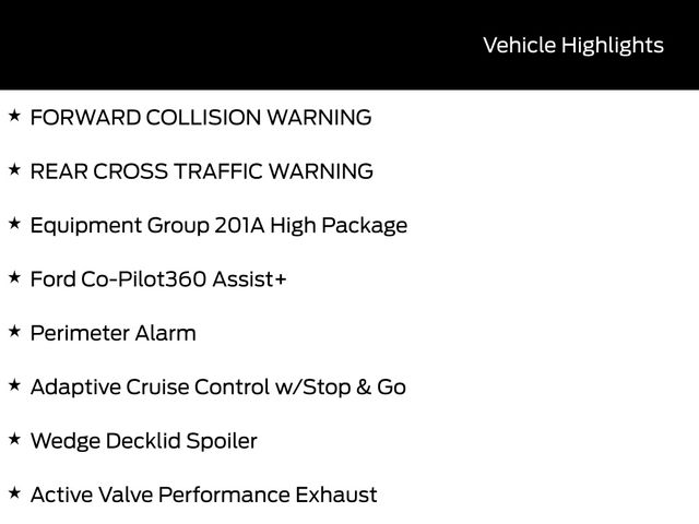 LEATHER SEATS, BACK UP CAMERA, BLUETOOTH, HEATED SEATS, REMOTE START, CRUISE CONTROL, POWER WINDOWS, POWER LOCKS, MULTI-ZONE CLIMATE CONTROL, STEERING WHEEL CONTROLS, LANE DEPARTURE WARNING, LANE KEEP ASSIST, APPLE CARPLAY, ANDROID AUTO, FORD SYNC, AUTOMATIC EMERGENCY BRAKING, FORWARD COLLISION WARNING, REAR CROSS TRAFFIC WARNING, Active Valve Performance Exhaust, Aluminum Foot Pedals, Bumpers: body-color, Equipment Group 201A High Package, Ford Co-Pilot360 Assist+, Magnesium Framed Panoramic Curved Display, One-Year Connected Navigation, Over-the-Top Racing Stripe, Perimeter Alarm, Power door mirrors, Wedge Decklid Spoiler. 21/32 City/Highway MPG