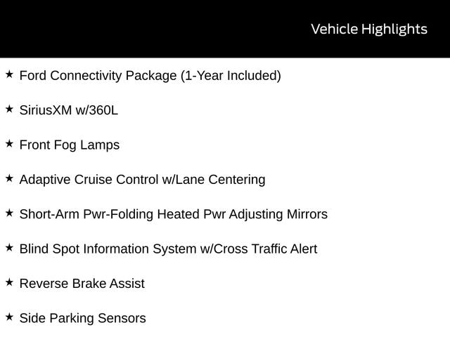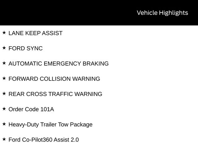 BACK UP CAMERA, BLUETOOTH, REMOTE START, CRUISE CONTROL, POWER WINDOWS, POWER LOCKS, STEERING WHEEL CONTROLS, LANE DEPARTURE WARNING, LANE KEEP ASSIST, FORD SYNC, AUTOMATIC EMERGENCY BRAKING, FORWARD COLLISION WARNING, REAR CROSS TRAFFIC WARNING, Adaptive Cruise Control w/Lane Centering, Blind Spot Information System w/Cross Traffic Alert, Ford Co-Pilot360 Assist 2.0, Ford Connectivity Package (1-Year Included), Frame Mounted Hitch Receiver, Front Fog Lamps, Heavy-Duty Trailer Tow Package, Order Code 101A, Reverse Brake Assist, Short-Arm Pwr-Folding Heated Pwr Adjusting Mirrors, Side Parking Sensors, SiriusXM w/360L, Tow/Haul Mode w/Trailering Wiring Provisions.