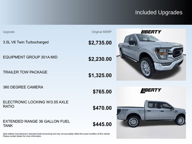 Standout features include the powerful 3.5L V6 EcoBoost engine, delivering exceptional performance and efficiency. The EQUIPMENT GROUP 301A MID and TRAILER TOW PACKAGE elevate this truck's capabilities, with features like the integrated trailer brake controller, pro trailer backup assist, and a class IV trailer hitch receiver. The 360-degree camera and extended-range fuel tank further enhance the driving experience, ensuring you can tackle any job with confidence.